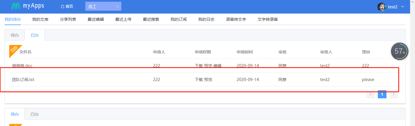 第二步:部门管理员进入员工-我的待办页面,可以看到用户222的申请信息,点击文件待办操作下的图标,点击同意或不同意,决定申请用户是否获得权限