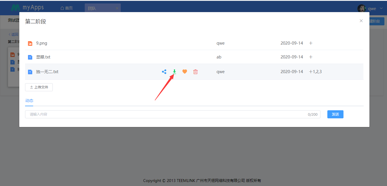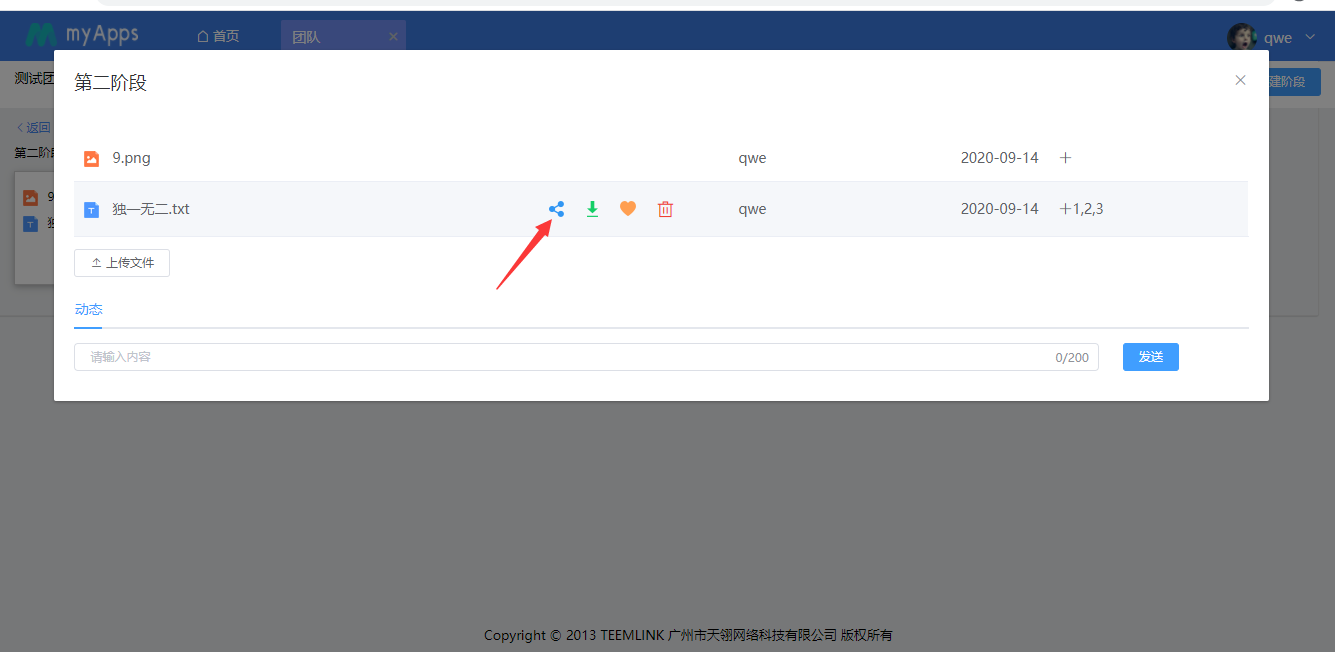 团队内部用户以及拥有权限的用户可对阶段内的文件进行上传、预览、下载、分享、收藏、删除等操作。