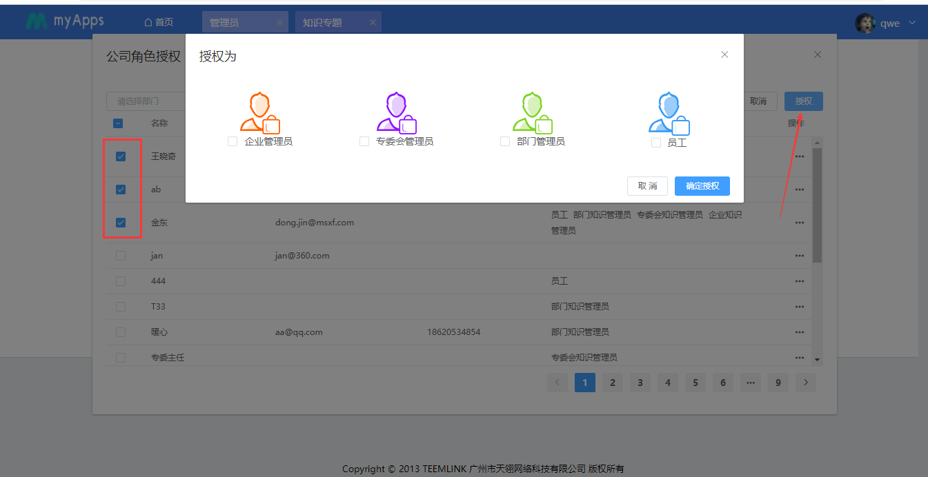 企业知识管理员可对用户进行授权