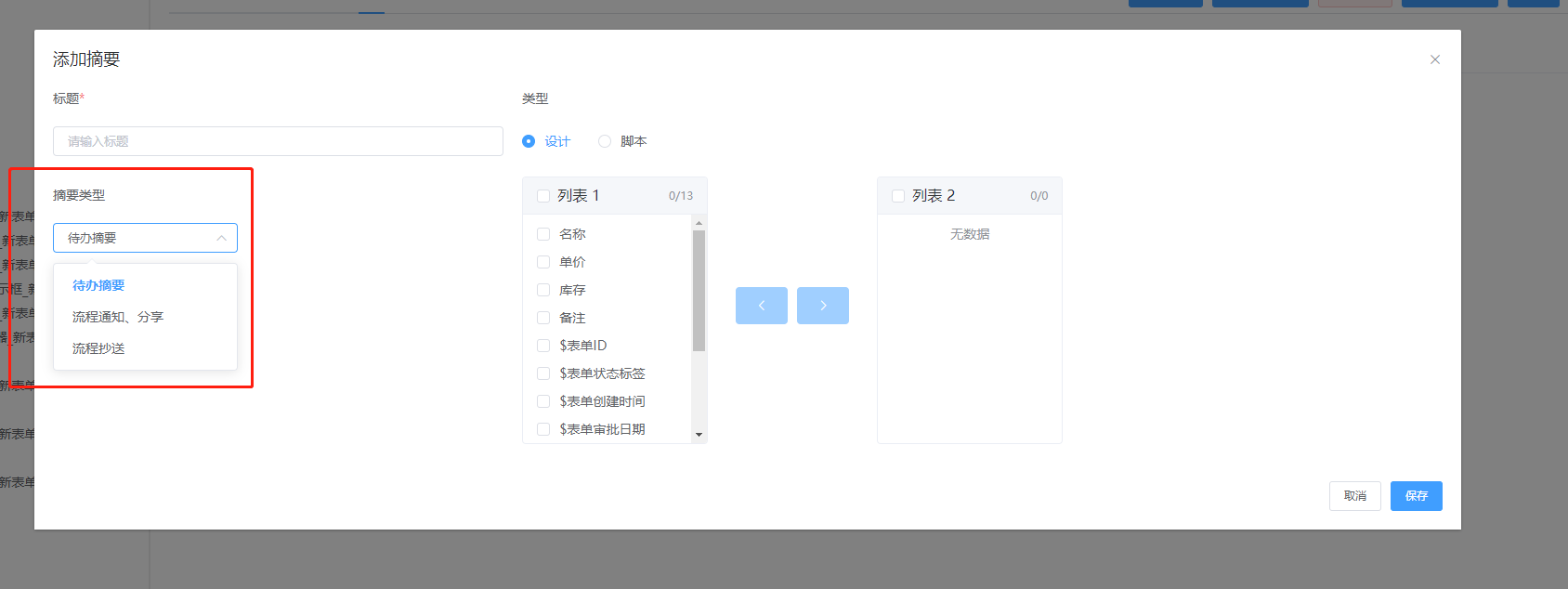控制摘要的内容通过什么方式定义,有两种类型,直接选设计字段(设置的显示字段会在流程主题中显示字段内容),也可写脚本进行计算字段。