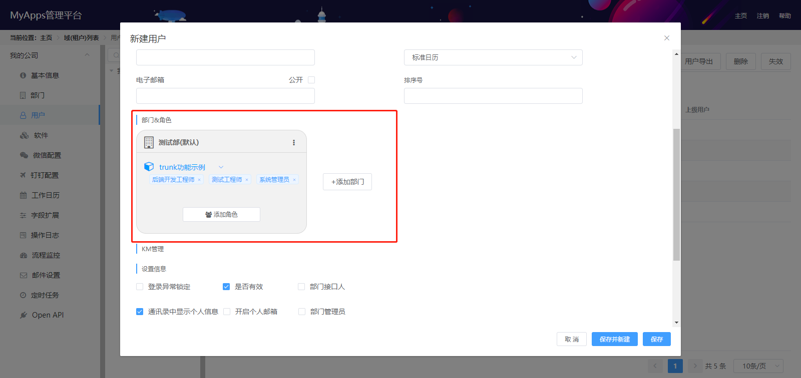第七步:设置用户部门及角色,每个用户必须设置一个默认部门和角色才能正常使用软件(角色配置在软件管理中详细说明)。