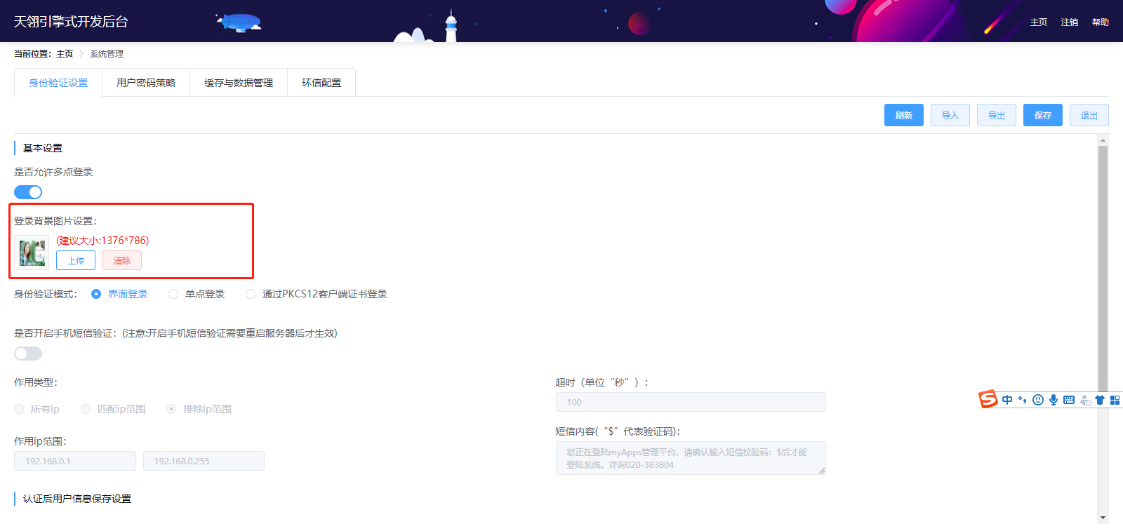 设置登录时平台进行的验证,超级管理员可以在后台中设置用户的身份验证方式:界面登录和单点登录,PKCS证书(通过U盘,移动硬盘等进行客户端证书验证登录)。开启或者关闭短信验证,开启后用户登录时会发送验证短信到登录平台的帐号绑定的手机号进行验证。可以在后台设置验证提示的内容。