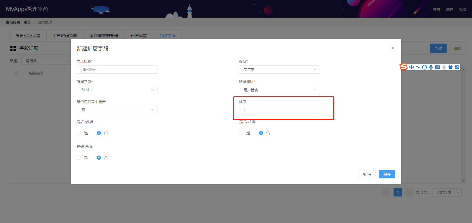 | 排序 | 字段扩展管理在列表中先后顺序。 |