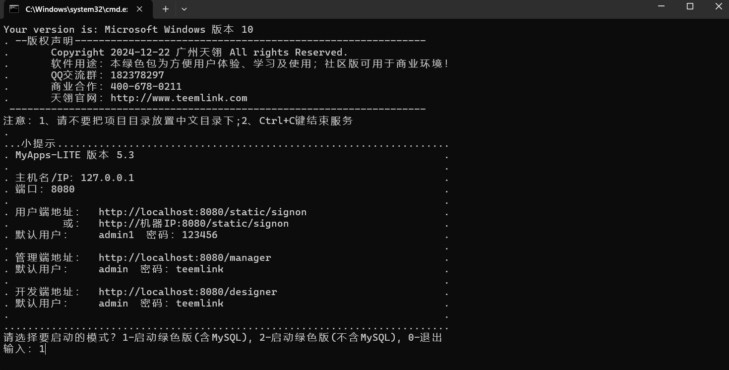 第三步:选择模式,1是直接启动(含MySQL);2是直接启动(不含MySQL);0是退出;