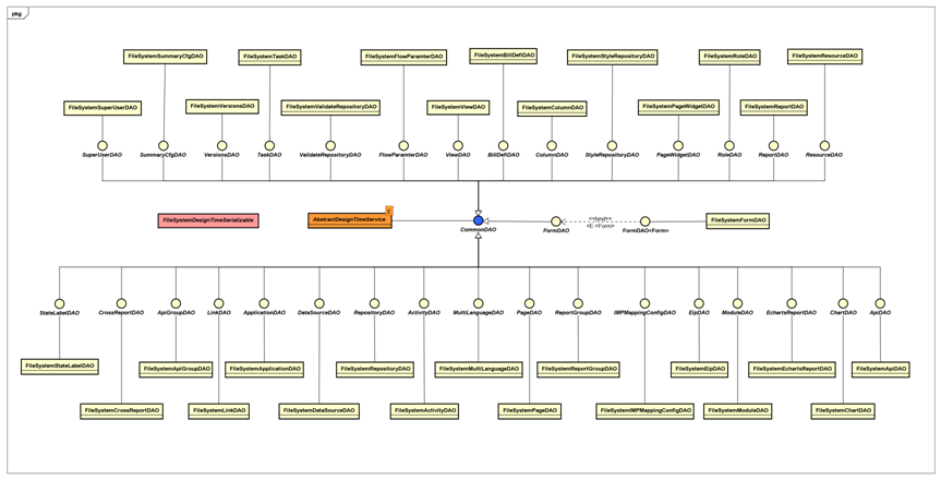 在MyApps中,DesignerTimeDAO的作用是存储软件(应用)配置信息(表单、视图、数据源等)。通常是将配置信息存储在文件系统中。类图如下: